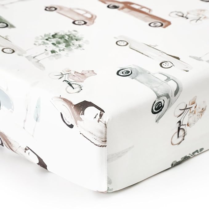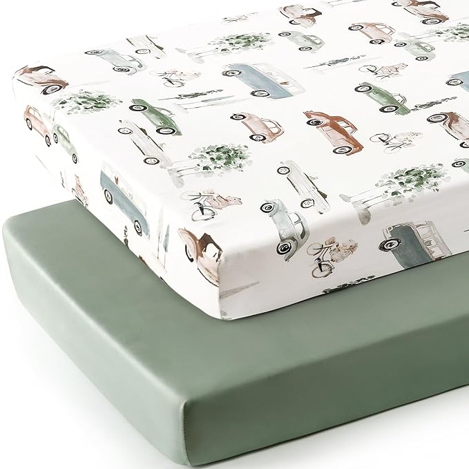 GRSSDER Stretchy Ultra Soft Jersey Knit Fitted Crib Sheets Set 2 Pack, Universal Fitted All Standard Crib Mattress Pads Safe and Snug, Crib Fitted Sheet for Baby, Neutral Pattern of Cartoon Cars Print