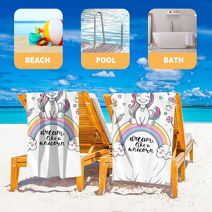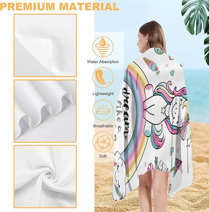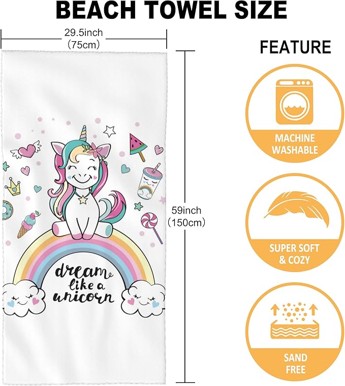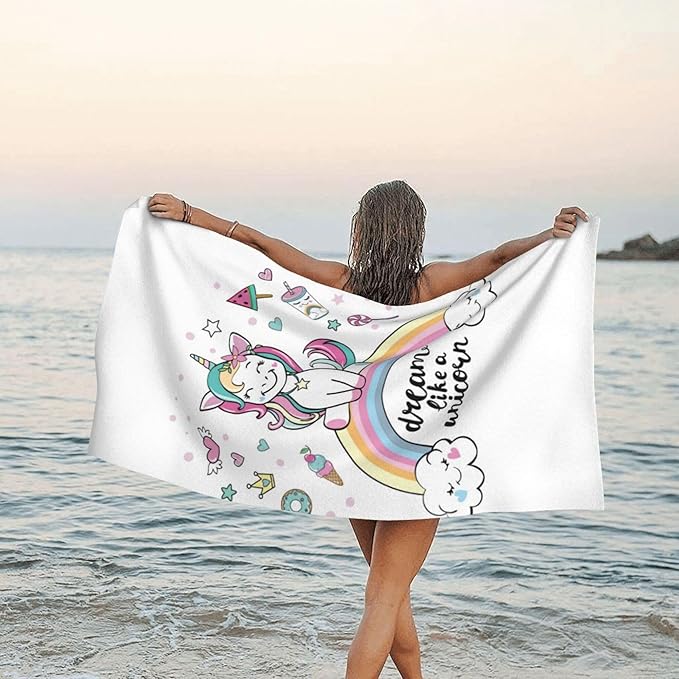 Microfiber Beach Towel, Cute Dream Unicorn on a Rainbow Beach Towels for Women Men, Extra Large 29.5” X 59”, Quick Drying Lightweight Sand Free Bath Swim Towel