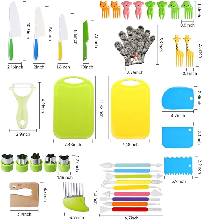 - ALL-IN-ONE TODDLER KITCHEN KNIVES COOKING SET - With 37 pieces included, this kids cooking set provides a wide range of kitchen utensils and tools, offering versatility in cooking activities for children. From kids-safe knives and cutting boards to cakes, fondant decorating hand sculpture tools, and vegetable cutters, it covers various aspects of food preparation and excites kids in the kitchen.