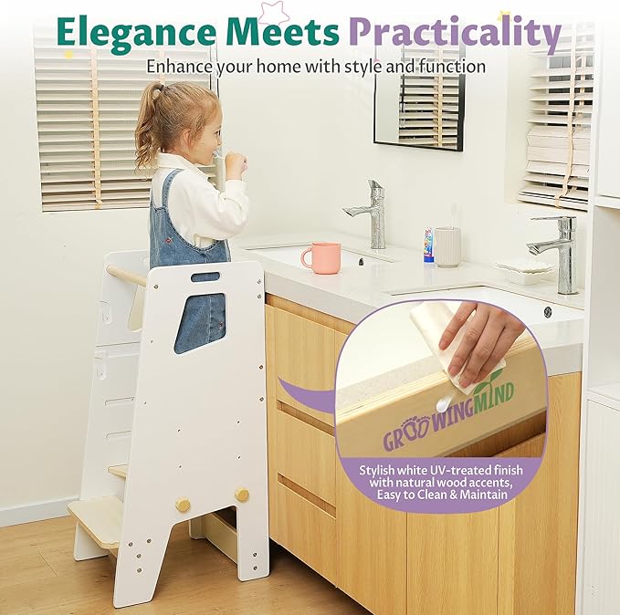 - ELEGANT & PRACTICAL: With its stylish white UV-treated finish and natural wood accents, our toddler learning tower enhances your home's decor while being easy to maintain, Plus, enjoy peace of mind with our 1-year warranty.