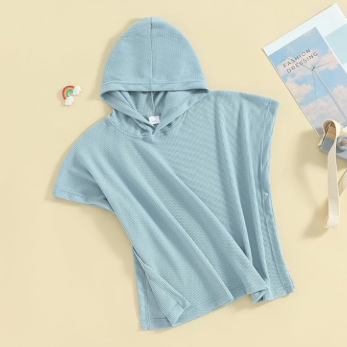 - Design: Kids hooded beach towel,hooded towels for kids,solid color waffle, loose fit design, loose cut is comfortable, side snap buttons convert towel into a wearable poncho.It works like a poncho for after the pool/bath/beach rather than a regular beach towel.Kids will love how easy this hooded beach towel is to put on and easily use their hands while being covered compared to other hooded towels.