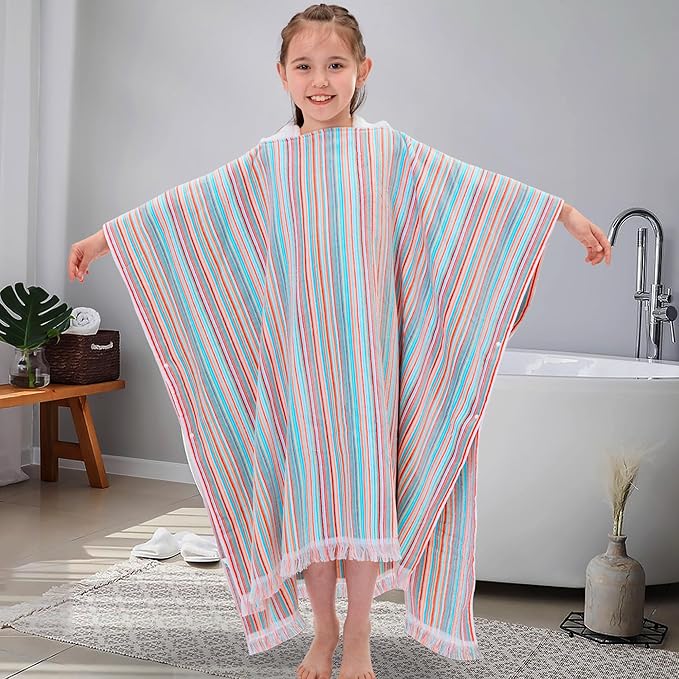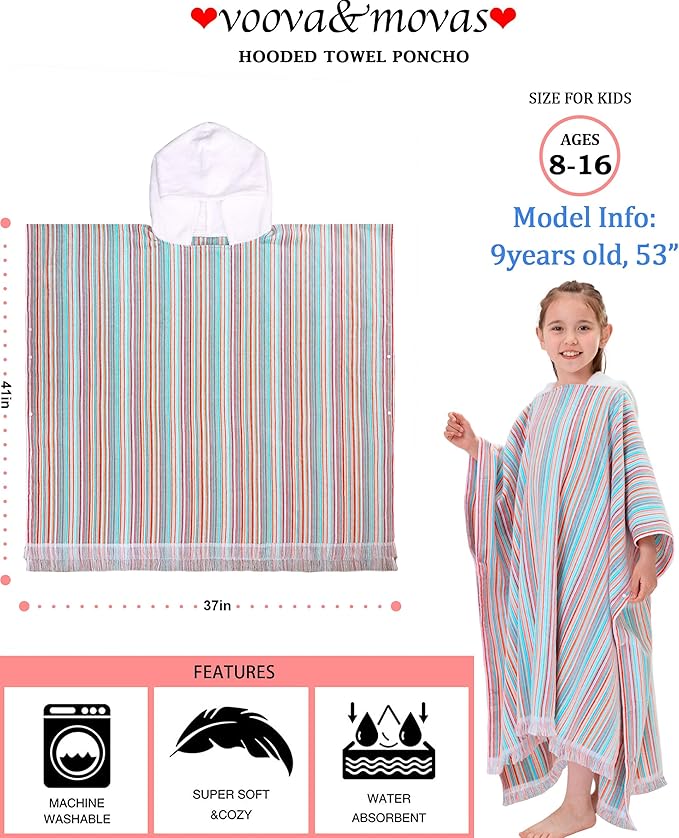 VOOVA & MOVAS Hooded Beach Towel for Big Kids | Large (8-16Years) Soft and Absorbent Cotton Poncho Towel Robe for Pool, Swim, and Bath, Rainbow