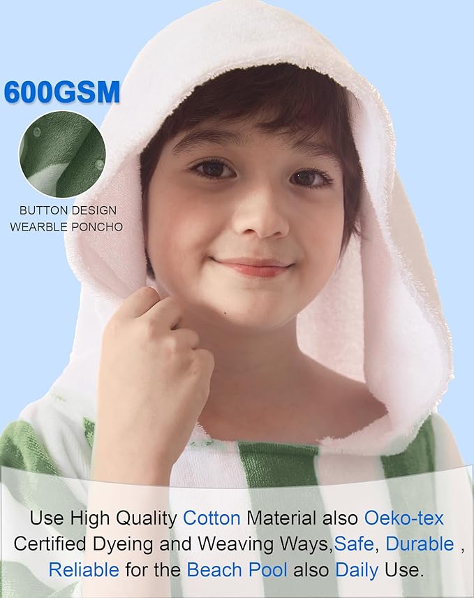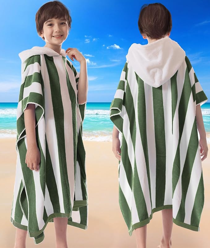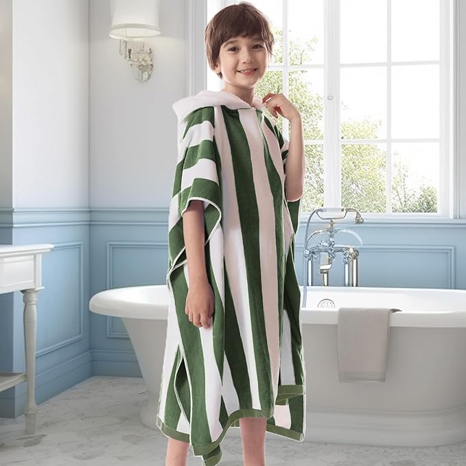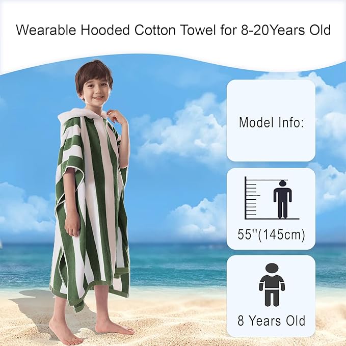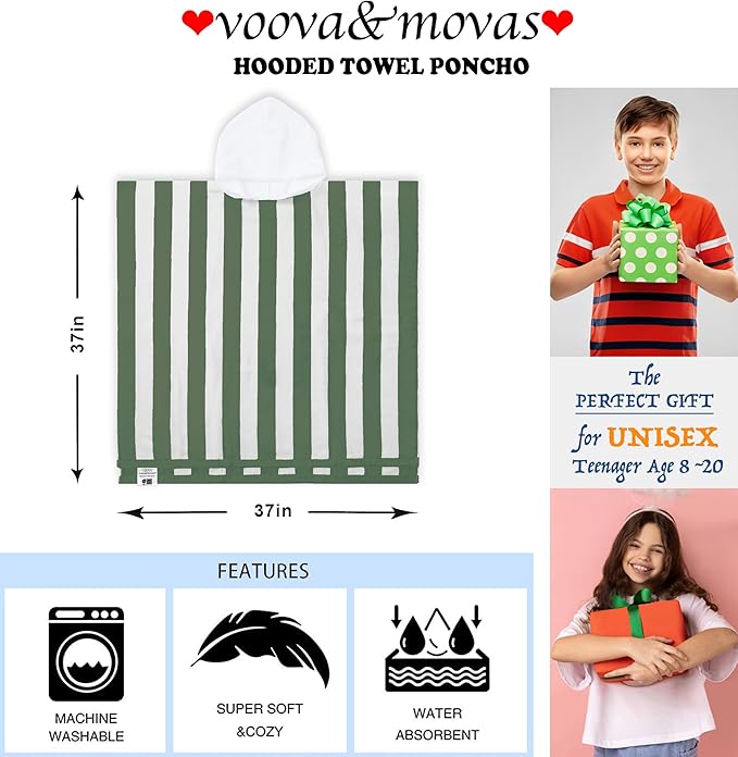 VOOVA & MOVAS Teens Hooded Towel Poncho | Soft, Absorbent Cotton Towel Robe | 8-16Years | Versatile for Pool, Swim,Beach and Bathroom | Hunter Green Cabana Stripe