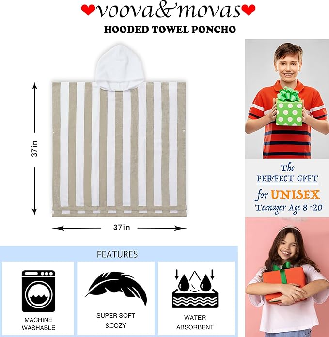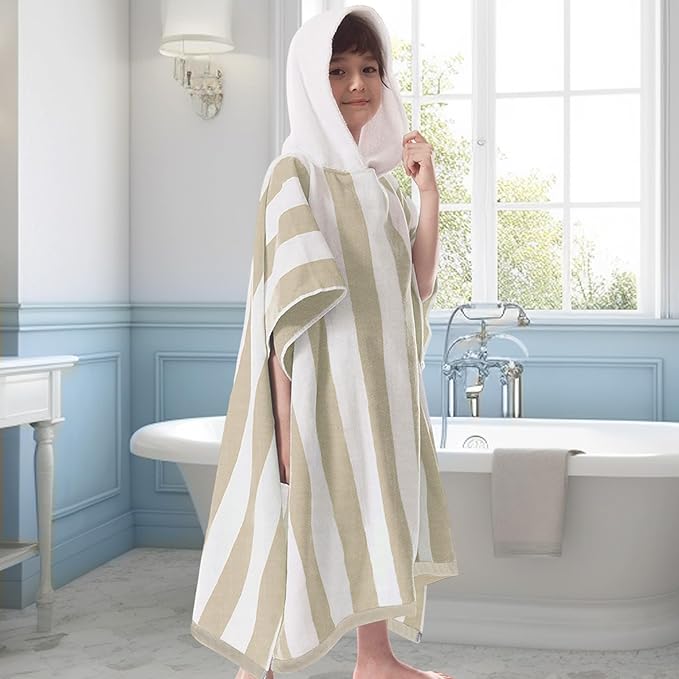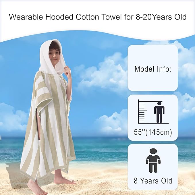 VOOVA & MOVAS Hooded Beach Towel for Big Kids | Large (8-16Years) Soft and Absorbent Cotton Poncho Towel Robe for Pool, Swim, and Bath, Tan Cabana Stripe