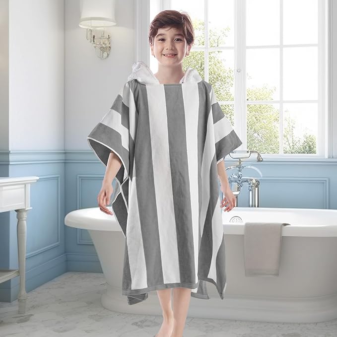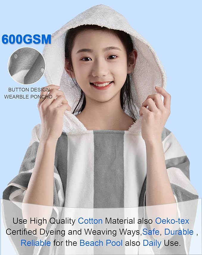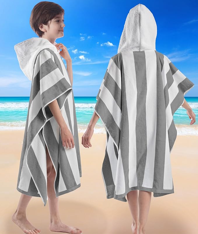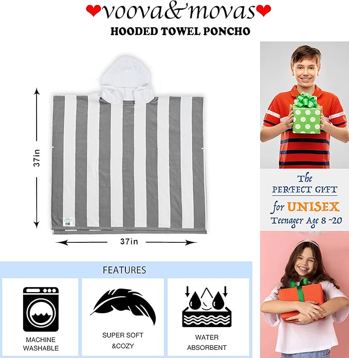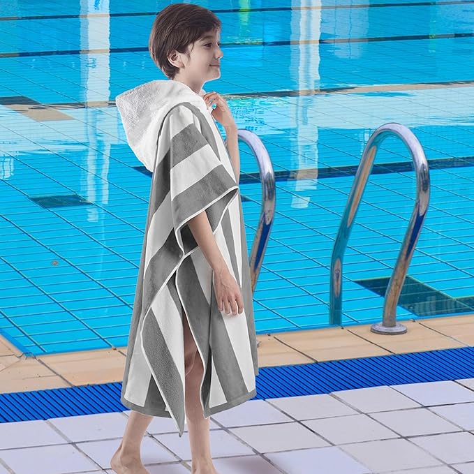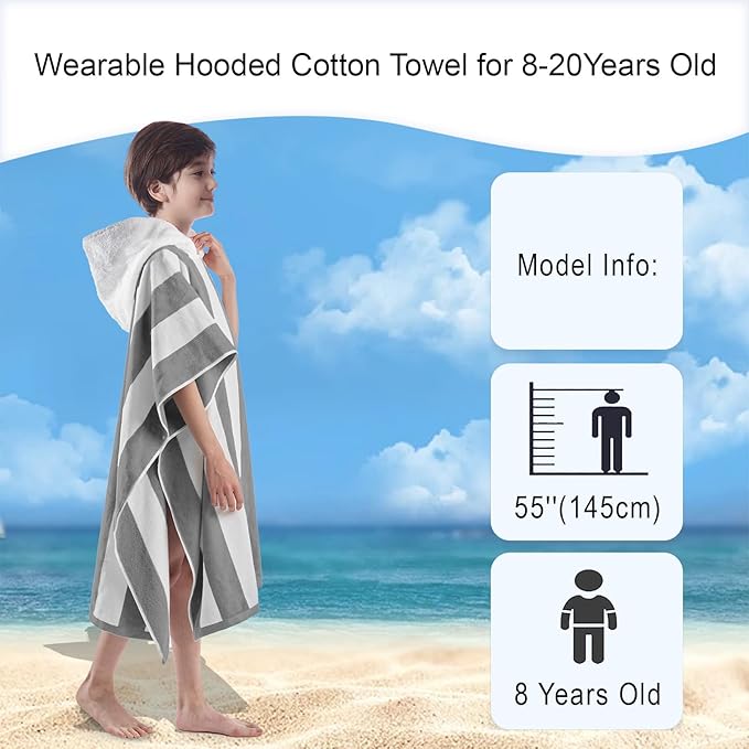 VOOVA & MOVAS Big Kids Poncho Towel with Hood - Teens Hooded Pool Towel Poncho (8-16Years), Large and Absorbent Cotton - Versatile for Beach, Pool, Swim, and Bath, Grey Cabana Stripe