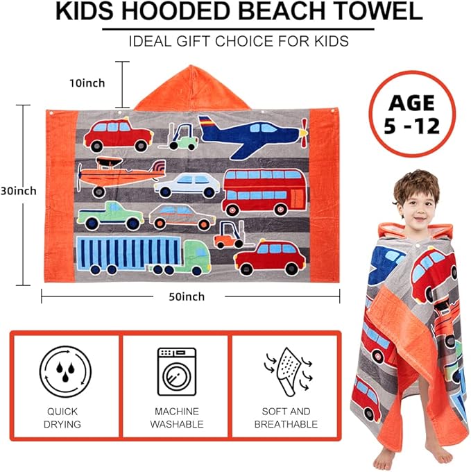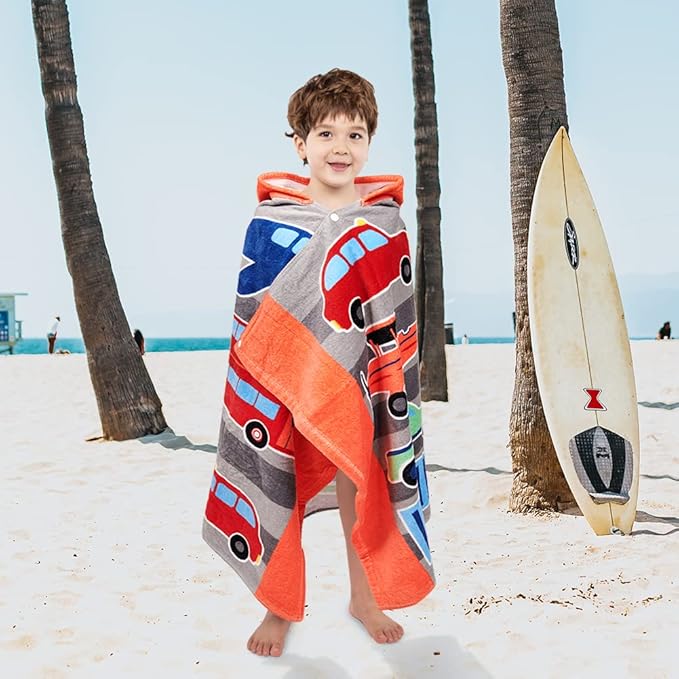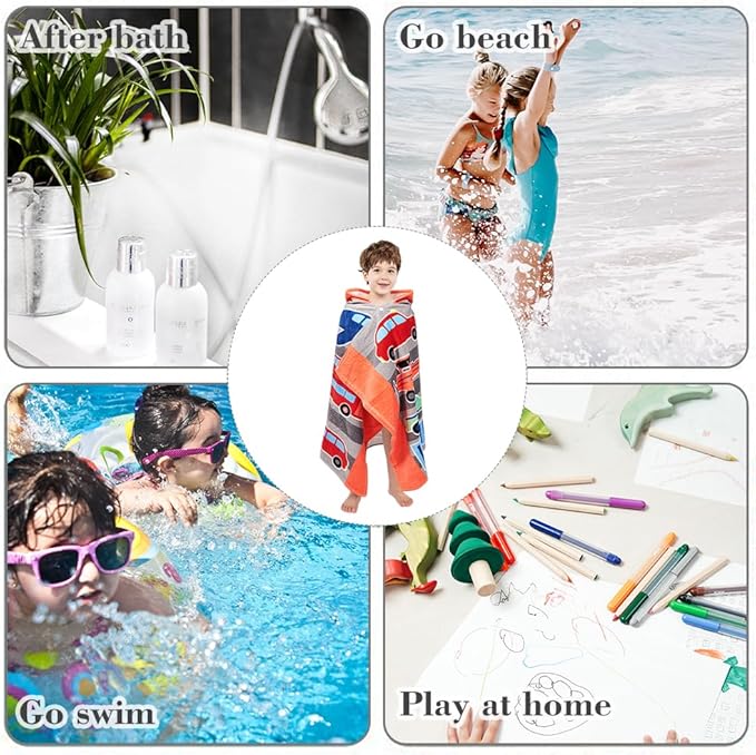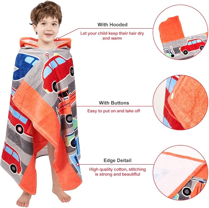 - [FUN CARTOON DESIGN] : The colorful cartoon elements of the kids' bath towel, such as Dinosaur, Shark, Unicorn, Car, all are so cute! Our towel with the hood gives kids happy experience.IDEAL GIFT CHOICE