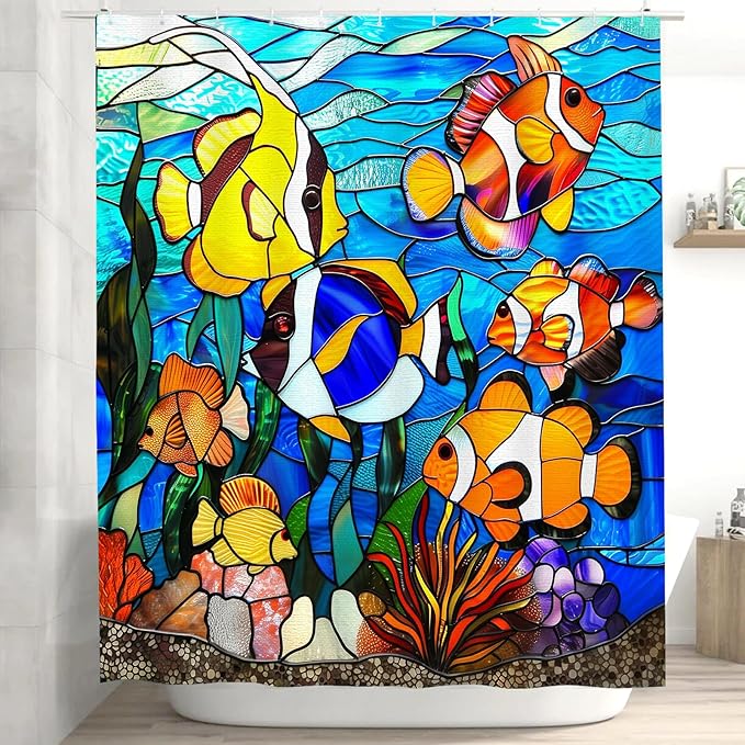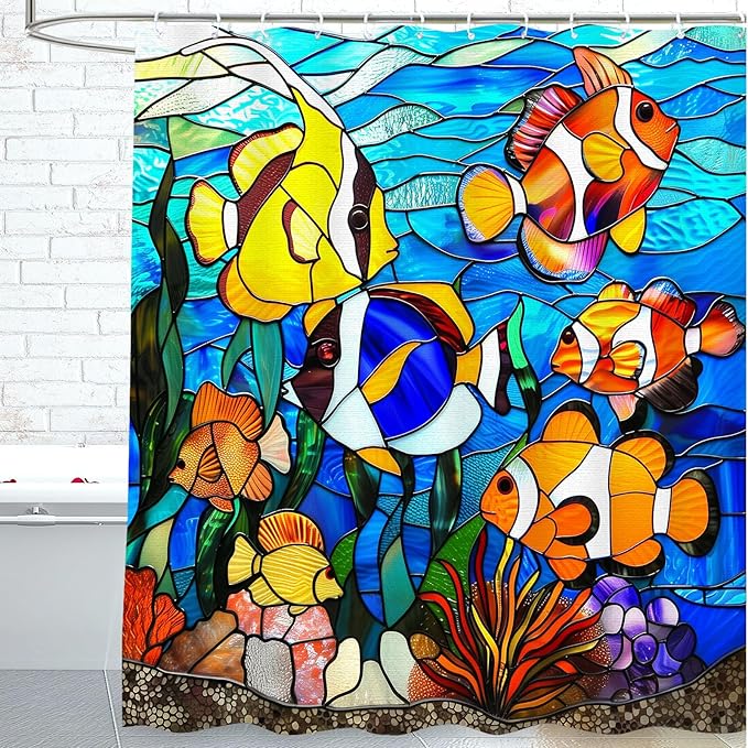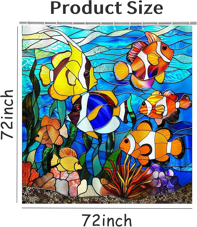 Fish Shower Curtain for Bathroom Fish Shower Curtains Home Bathroom Bathtubs Stained Glass Fish Decor Polyester Shower Curtain Waterproof Washable Durable 12 Hooks 72"x72"