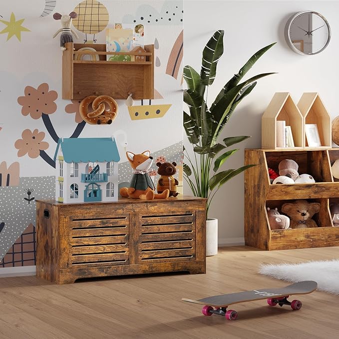 DINZI LVJ Storage Chest, 43.3” Wooden Toy Box with 2 Safety Hinges, Retro Entryway Shoe Storage Bench with Flip-Top, Sturdy Large Storage Trunk for Living Room, Bedroom, Easy Assembly, Rustic Brown