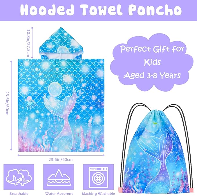 Kids Beach Towels for Girls, Unicorn Hooded Beach Pool Towels for Kids, Ultra Soft & Super Absorbent Kids Toddler Poncho Towels for 3-8 Years, 24"x24" (Blue Mermaid)