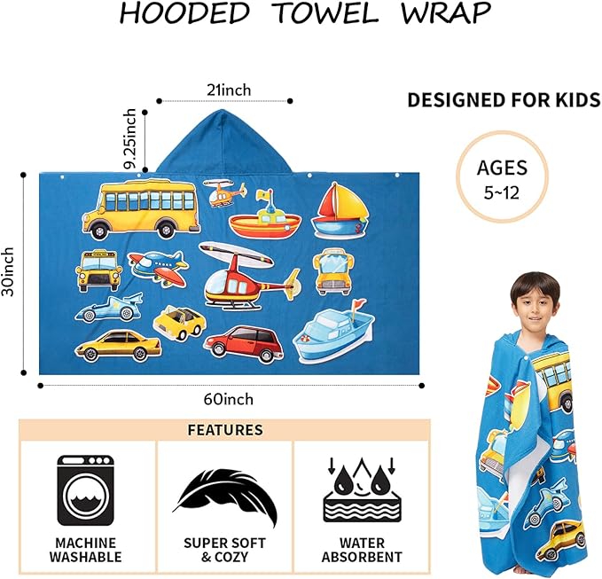- SIZE - This hooded towel measures 60 x 30 inches, the hood measures 21 x 9.25 inches. Perfect for kids from 3 feet up to 5 feet and 5 inches tall.