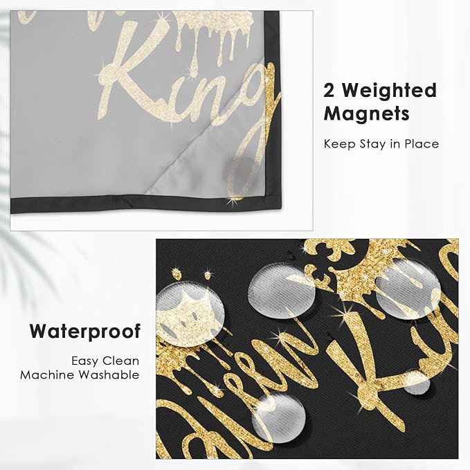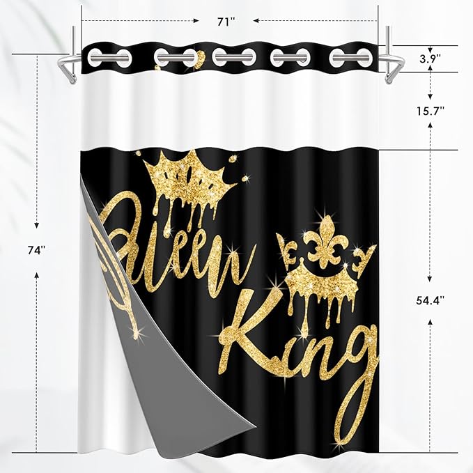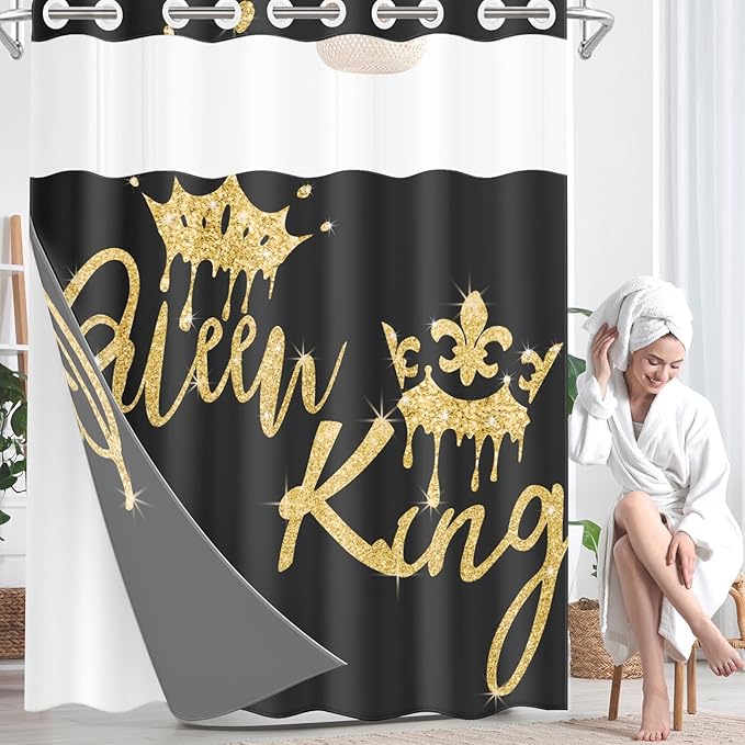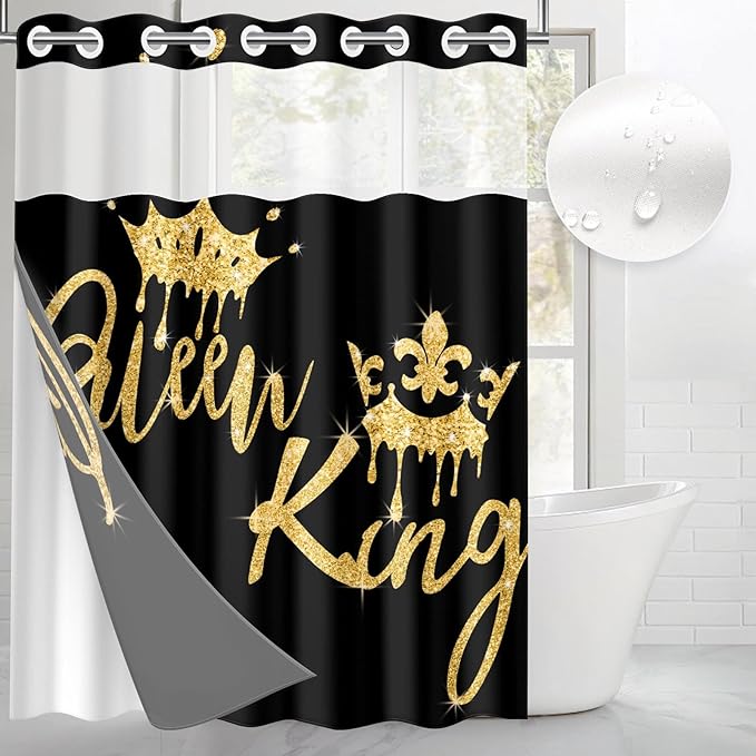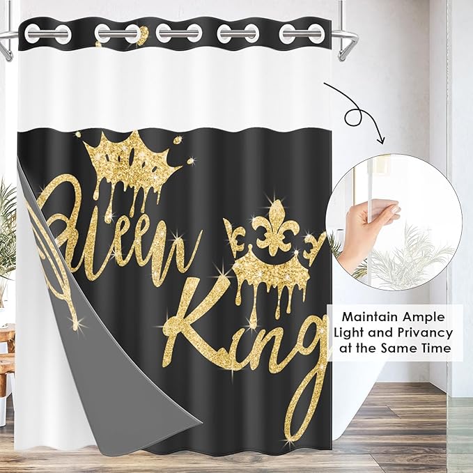 King and Queen No Hook Shower Curtain with Snap in Liner, Black and Gold Glitter Bath Curtain with Double Layers Waterproof Fabric and Mesh Top Window 71x74 Inch