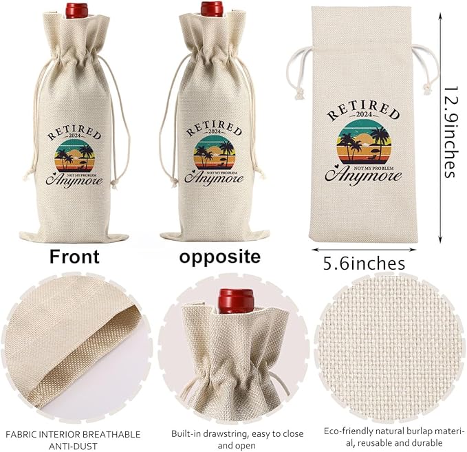 - 【Retirement Gifts Ideas】 Don't just stop at retirement wine bag bottles! This fun retirement wine bag is the perfect addition to a retirement party, and also it's a perfect gift idea, as it not only decorates the bottle, but is also suitable for storing all kinds of holiday gifts, make it a must every time you celebrate a variety of festivals and events! Make every gathering a ritual!