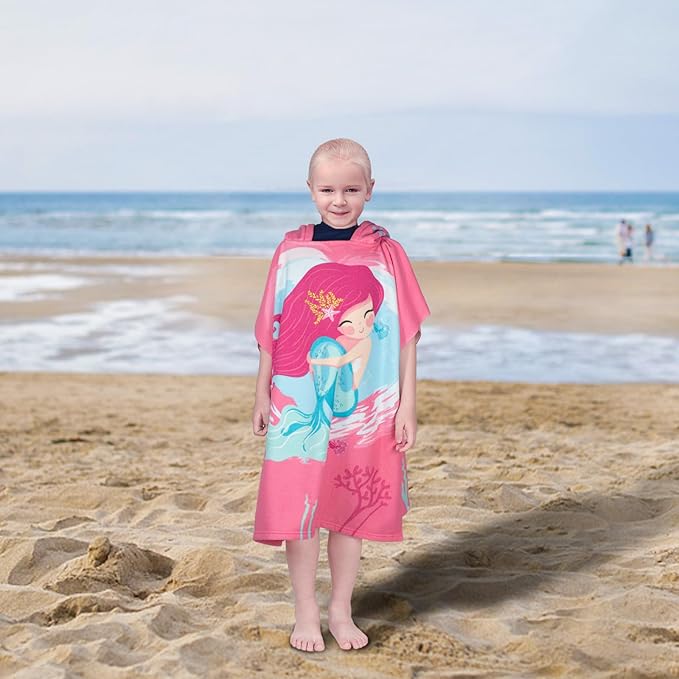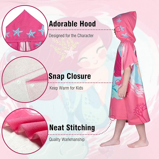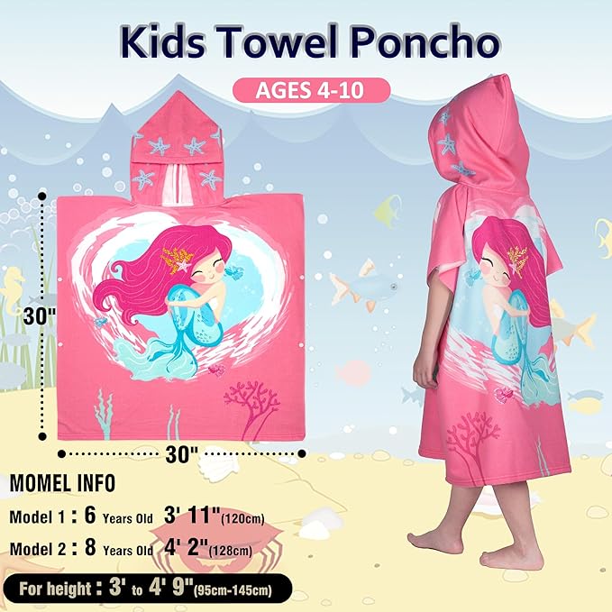 - 【Multi Uses】There's enough room to wrap around and cuddle up in. This poncho beach towels for kids are designed to dry their body or keep warm for kids, girls, and boys. It’s great for after the beach, pool, or bath, as well as to cover up before and after swim lessons. The size is 30“ W X 30 "L for kids around 37" to 57" height.