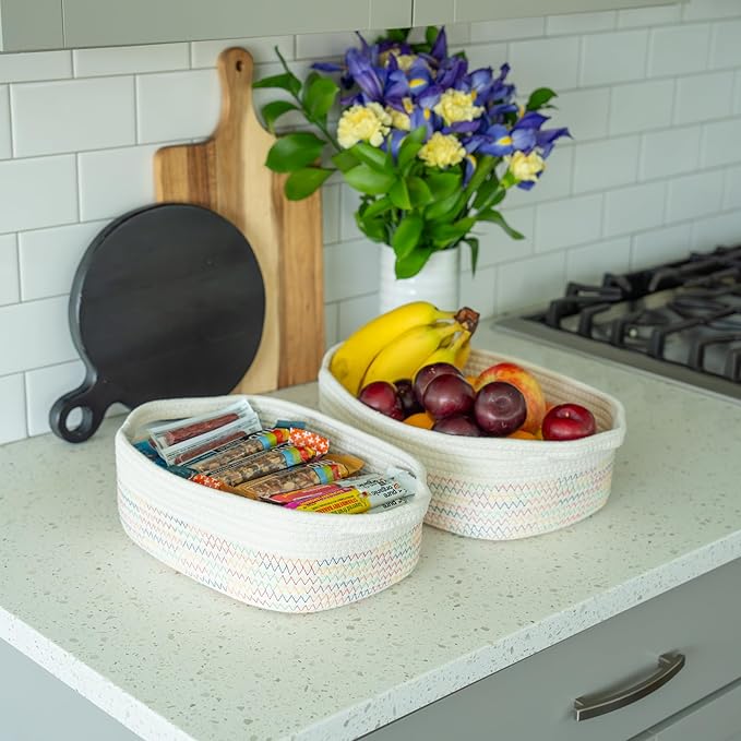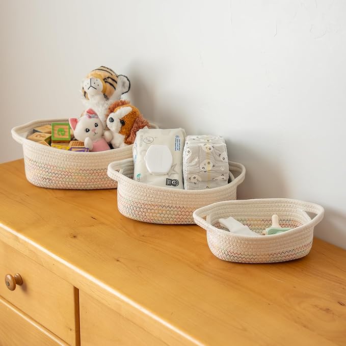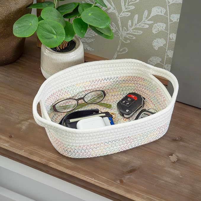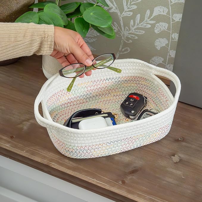 - Premium Woven Cotton Rope Baskets: These beautiful small rope baskets for bathroom provide just the right depth for displaying home decor in a kitchen, storing hand towels in the bathroom, as a baby basket organizer for nursery decor, or as a front entry catch-all.