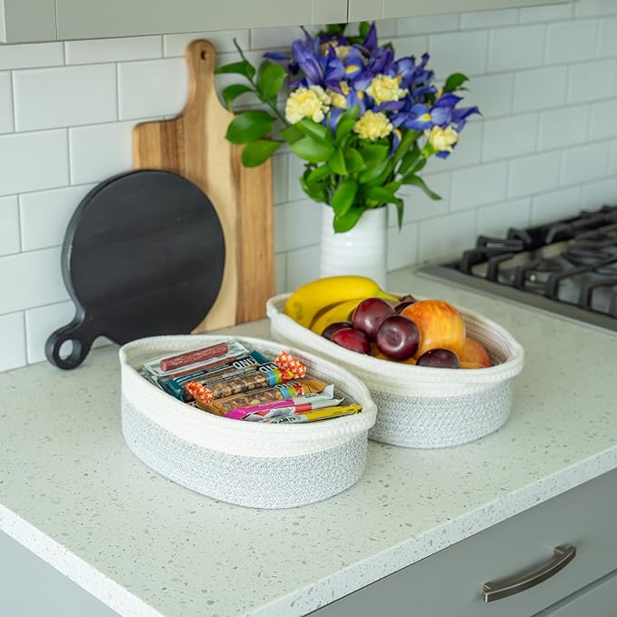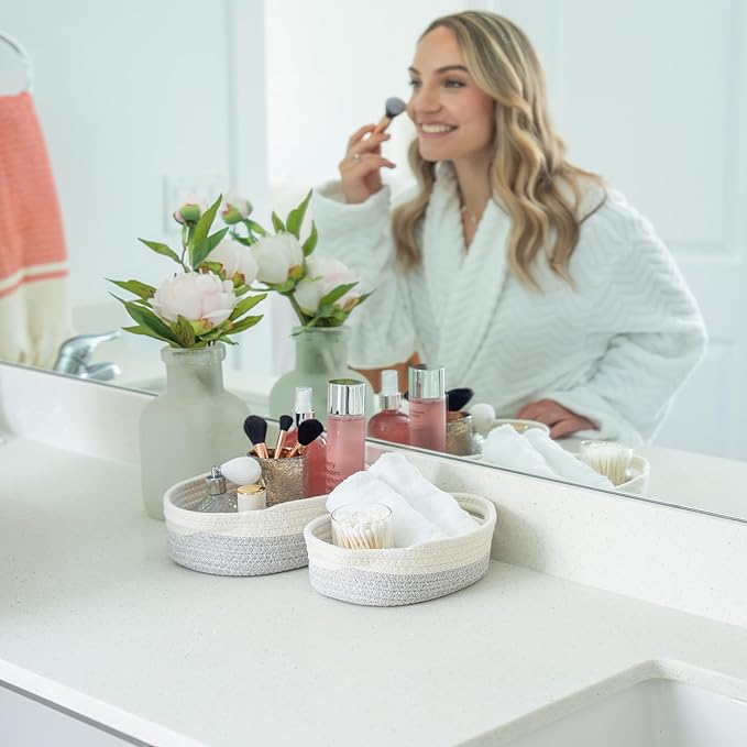 - Premium Woven Cotton Rope Baskets: These beautiful small rope baskets for bathroom provide just the right depth for displaying home decor in a kitchen, storing hand towels in the bathroom, as a baby basket organizer for nursery decor, or as a front entry catch-all.