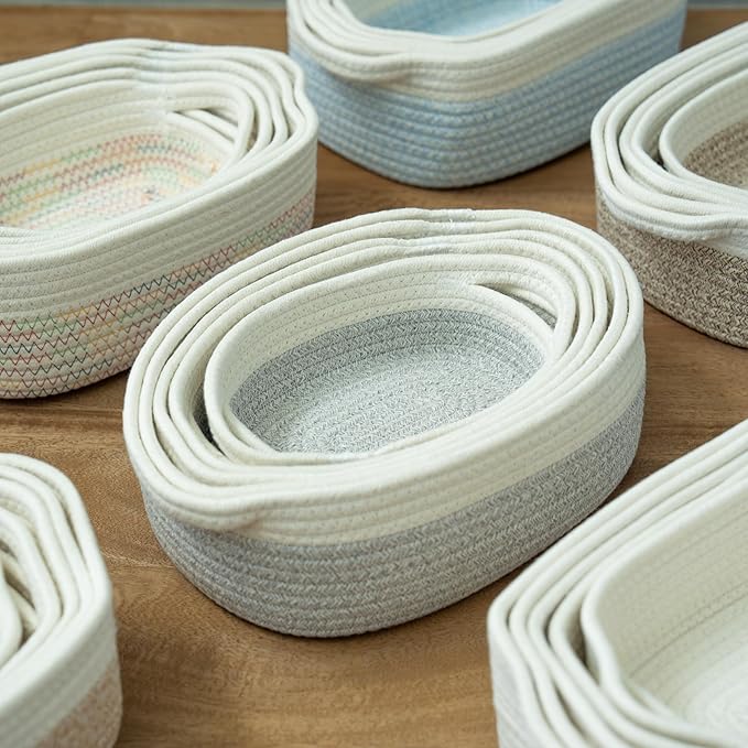 - Beautiful Color Variations: Your style is one of a kind, just like you, which is why these woven mini baskets for storage come in 7 exciting colors including full white, honey & white, grey & white, brown & white, stitches rainbow, blue & white and pink.