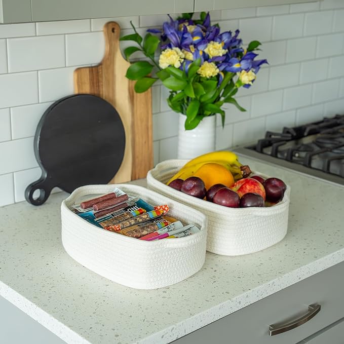 - Premium Woven Cotton Rope Baskets: These beautiful small rope baskets for bathroom provide just the right depth for displaying home decor in a kitchen, storing hand towels in the bathroom, as a baby basket organizer for nursery decor, or as a front entry catch-all.