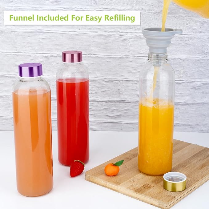 - GLASS BOTTLES FOR JUICING AND MORE: Durable stainless steel lid with air and water-tight seals, it’s completely airtight to keep your beverage fresh without any worry of spills. Throw this glass water bottle in your bag or car and get a healthy start to your day with a juice, smoothie, brew, ice tea, iced coffee, milkshakes, Kombucha. The 100% leak proof glass bottle will never leave a leaky mess no matter how you place it. The clear glass helps you quickly spot the drink you're in the mood for.