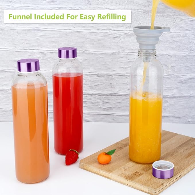 - GLASS BOTTLES FOR JUICING AND MORE: Durable stainless steel lid with air and water-tight seals, it’s completely airtight to keep your beverage fresh without any worry of spills. Throw this glass water bottle in your bag or car and get a healthy start to your day with a juice, smoothie, brew, ice tea, iced coffee, milkshakes, Kombucha. The 100% leak proof glass bottle will never leave a leaky mess no matter how you place it. The clear glass helps you quickly spot the drink you're in the mood for.