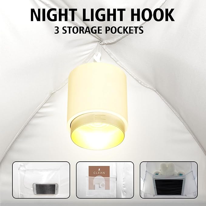 - Multifunction: Inside the bed tent, you'll find 3 storage pockets, an iPad pocket, 2 charging ports, and a night light hook at the top in the middle, each corner with djustable buckle, and the whole floor sits under the mattress-no slip!