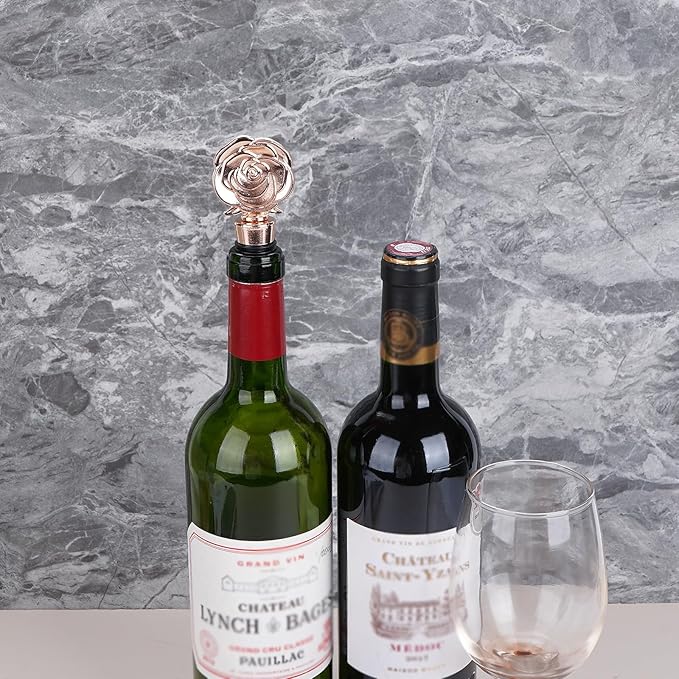 - Made of high-quality metal alloy in a detailed rose shape design.The bottle stopper is wrapped in food grade silicone to keep your wine fresh