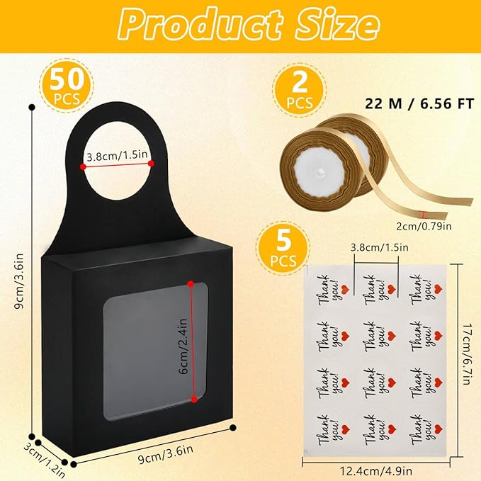 50 Pcs Wine Bottle Box with Window,Hanging Foldable Wine Boxes for Gifts, Kraft Paper Empty Bottle Hanger Box with Thank You Stickers and Champagne Ribbon for Candy Chocolate Cookies(Black)