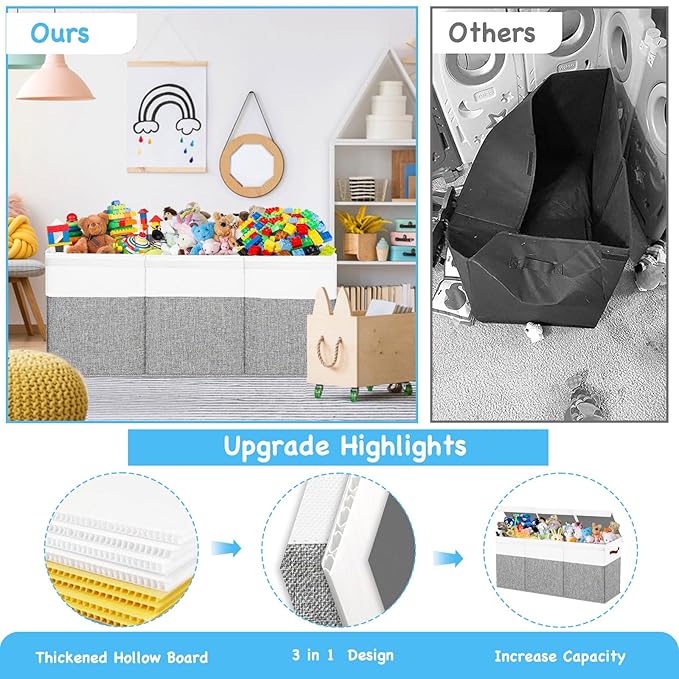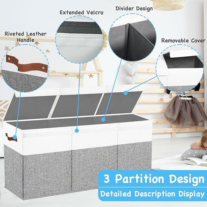 - Elegant Design-Our toy box features a two-tone stitching design and faux leather handles on both sides secured with metal rivets, creating a light luxury and elegance effect for your home. Three Velcro-fastened lids ensure easy access while also allowing you to stack other lighter items on top.