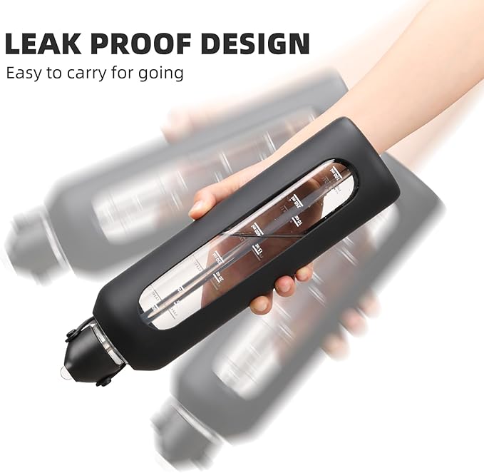 - 【HUMANIZED DESIGN DETAILS】The 20 oz glass water bottle featured with straw lid with premium handle lid, 100% leak-proof.The motivational 1 Liter glass bottles have two ways to drink water by a high quality straw and drink directly after remove the lid, which is very convenient and fast,and it also conveniently fits in cup holders.
