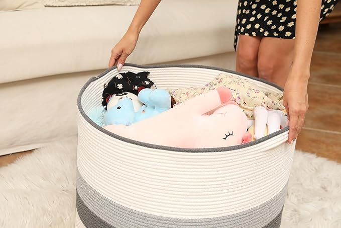 24" x 24" x 17" Max Size Large Cotton Rope Basket, Extra Large Storage Basket, Woven Laundry Hamper, Cloth Storage Bin, for Blankets Clothes Towels Pillows in Living Room, Double Graded Grey