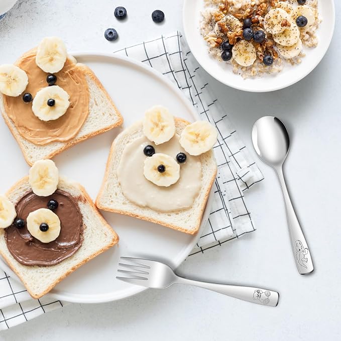 - PERFECT FOR KIDS LITTLE HANDS: Easy for the kiddos to handle and not too heavy to use. Easy for kids to hold and learn with. These silverware are so fun with cute cartoon pattern, helps with learning to eat. Sharp enough to poke the food without hurting them. This silverware is so pretty and the perfect size for kids!