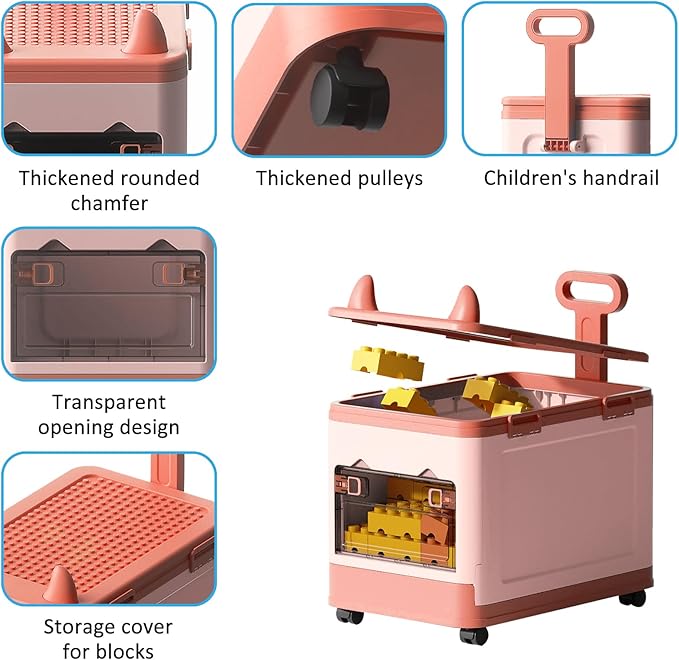 - Novel Design: Cute monster shape. The kids toy chest adds small armrests and 4 removable silent universal wheels, easy for children to take anywhere. The lid is compatible with the block base and can be used as a block table