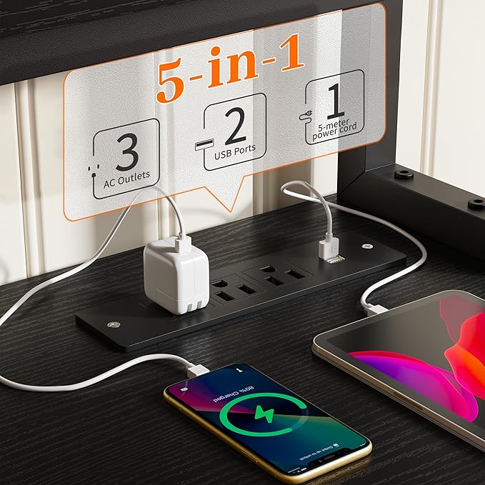 - 【Desk with Charging Station】This black desk comes with 3 standard sockets and 2 ports, providing fast charging ports for your mobile phones, headphones, tablets, mobile power supplies and gaming devices, making your work and life more convenient.Whether in the game room or study or bedroom, The desks can easily be your best partner.