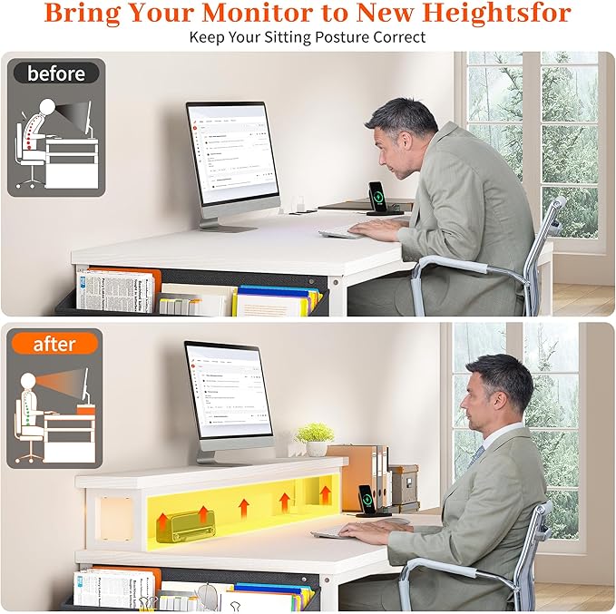 - 【Small Desk with Shelves】This monitor stand makes it easy to raise the screen to eye, with a more ergonomic design and effective in reducing back and neck pain.Make the process of studying, working and playing more comfortable.