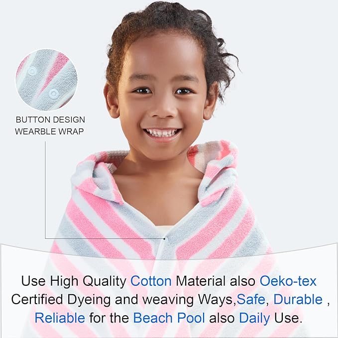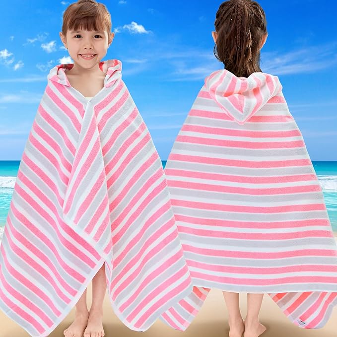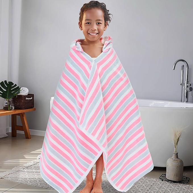 VOOVA & MOVAS Hooded Towels for Kids - 100% Cotton (3-10Years) - Quick Dry Absorbent Lightweight Towel for Pool | Swim | Beach | Bath, Girls Wrap Towel with Hood, Pink Gray Stripe