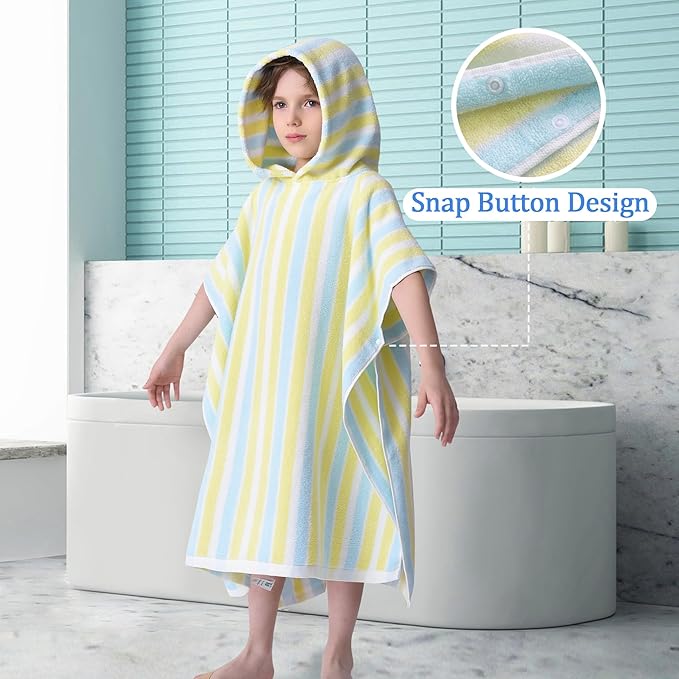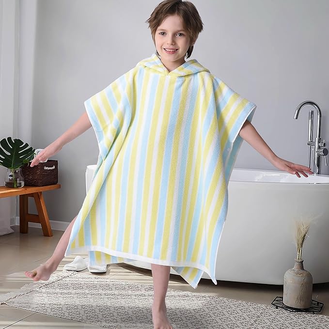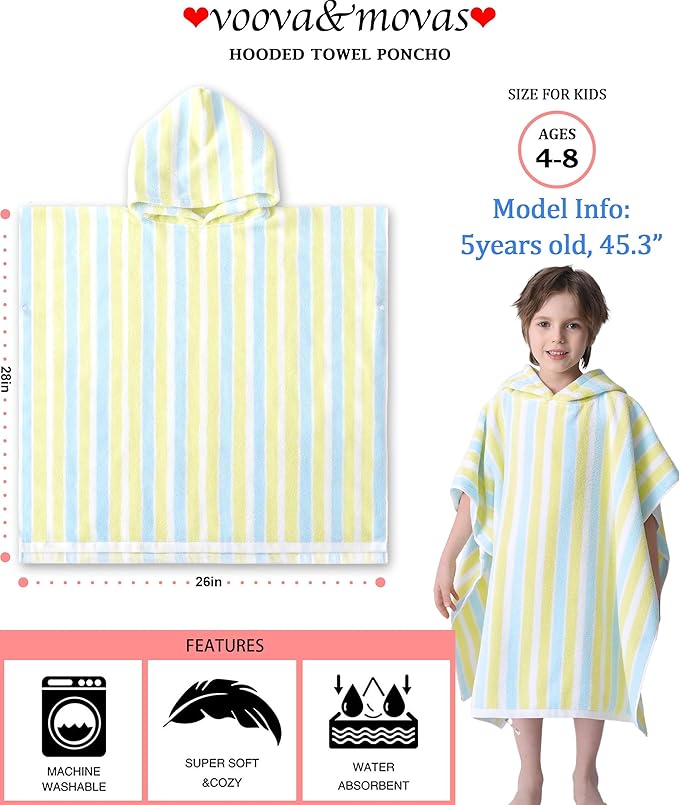 VOOVA & MOVAS Poncho Towels for Kids - 100% Cotton (4-8Years) - Absorbent Quick Dry Lightweight Hooded Towel Robe for Pool | Swim | Beach | Bath | Bathroom, Yellow Blue Stripe