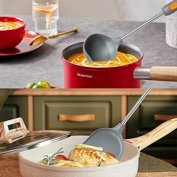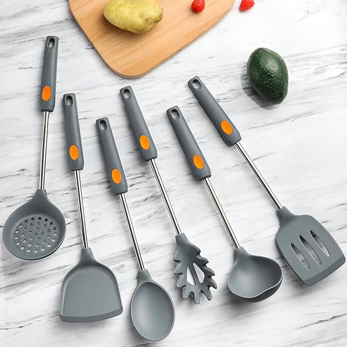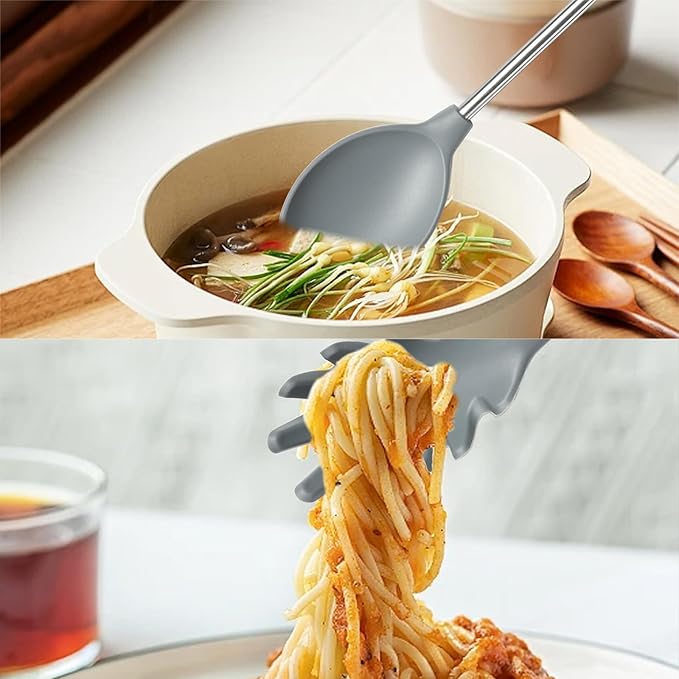 - Cooking Utensil Set: 6 Pieces basic kitchen utensils set slotted turner, a spaghetti server, a solid spoon, a slotted spoon, a mixing spoon, and a soup ladle, A practical silicone cooking utensils set meet all kinds of your daily cooking needs.