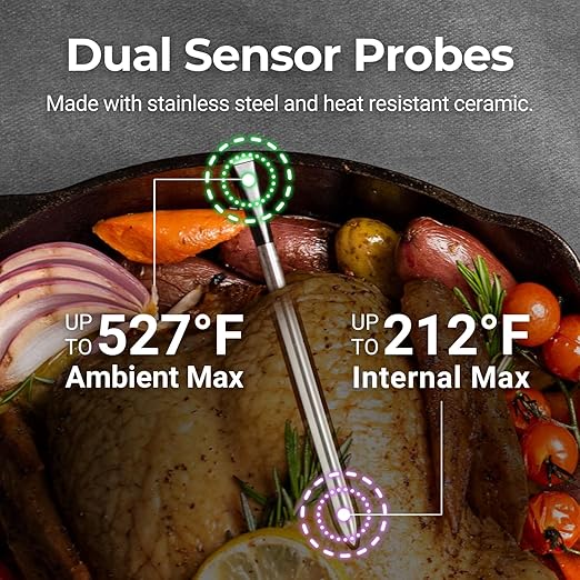 - Dual Temperature Sensors: Accurately measures both internal meat temperature and ambient temperature for precise cooking control.