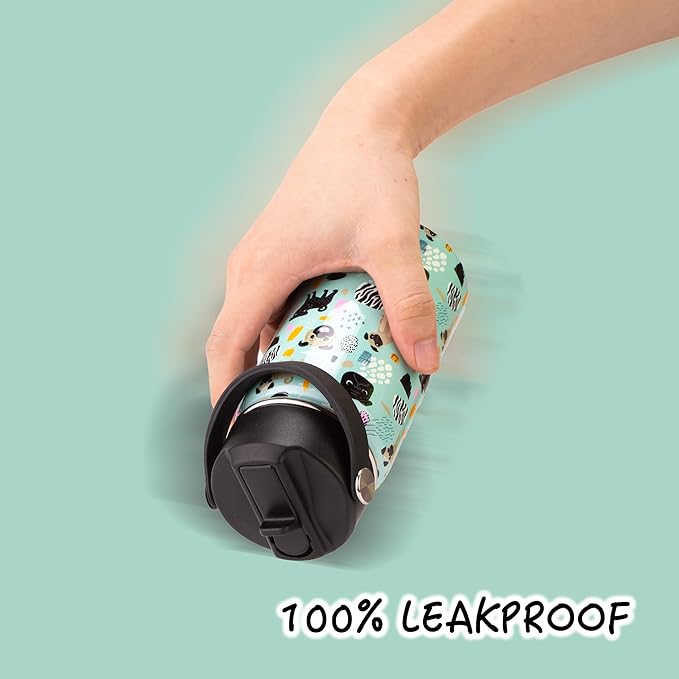 12oz Kids Insulated Water Bottle with Flip Straw & Big Handle, Cute Dog, Double Wall 18/8 Stainless Steel, Leakproof Gift for Kids Boys Girls to School Travel Sports, Hands Wash Only, Green