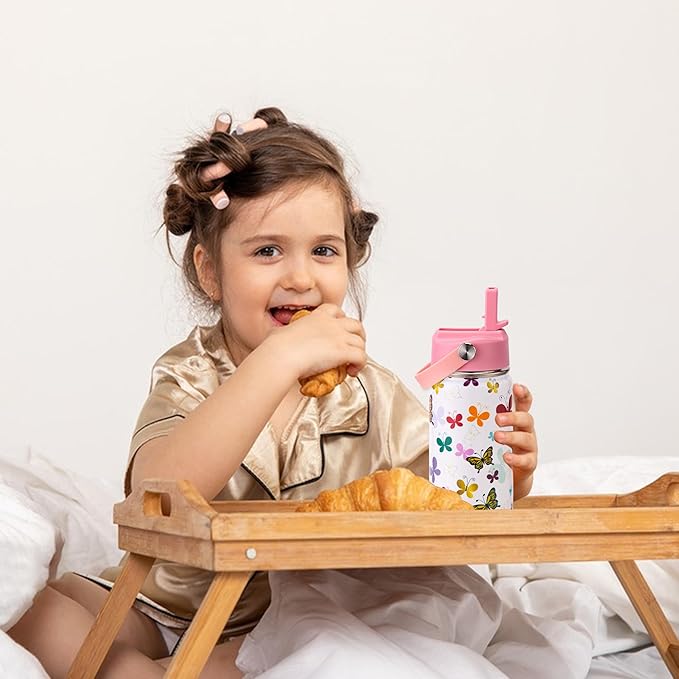 12oz Kids Insulated Water Bottle with Flip Straw & Big Handle, Butterflies, Double Wall 18/8 Stainless Steel, Leakproof Gift for Kids Girls to School Travel Sports, Hands Wash Only, Pink