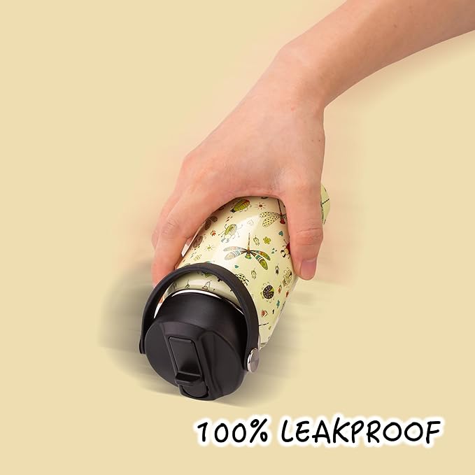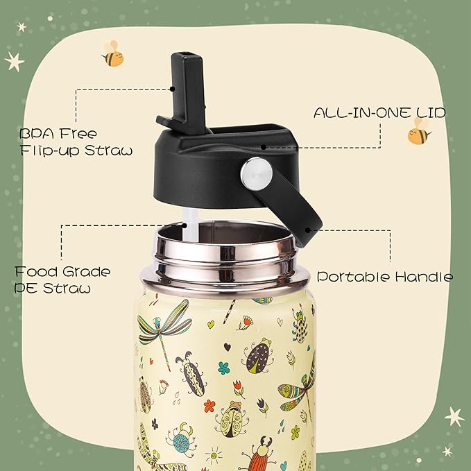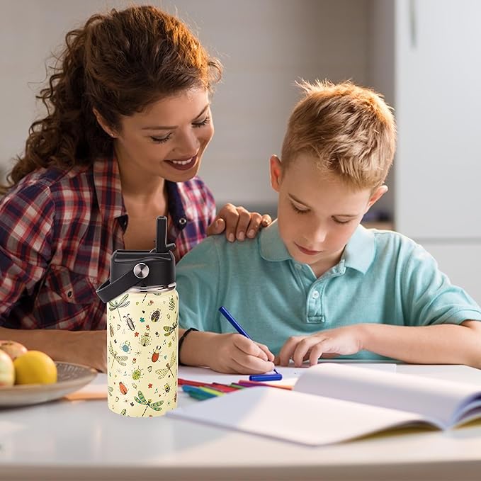12oz Kids Insulated Water Bottle with Flip Straw & Big Handle, Dragonfly & Bugs, Double Wall 18/8 Stainless Steel, Leakproof Gift for Kids Boys Girls to School Travel Sports, Hands Wash Only, Yellow
