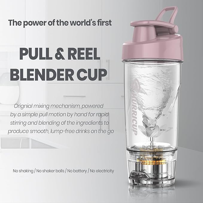 - ✔️Efficient High Gear Ratio Mechanism: Hurricup protein shake bottle enables high-speed rotation (20 rounds per pull) for quick and thorough blending of ingredients. The easy pull-and-reel action offers faster, more even stirring.
