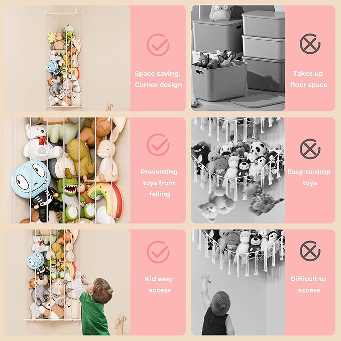 - Easy to Assemble: No additional tools are required. Our stuffed animal organizer is easy to install, making it the best choice for storing teddy bears, baby stuffed animals, plush toys, and more.