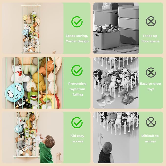- Easy to Assemble: No additional tools are required. Our stuffed animal organizer is easy to install, making it the best choice for storing teddy bears, baby stuffed animals, plush toys, and more.
