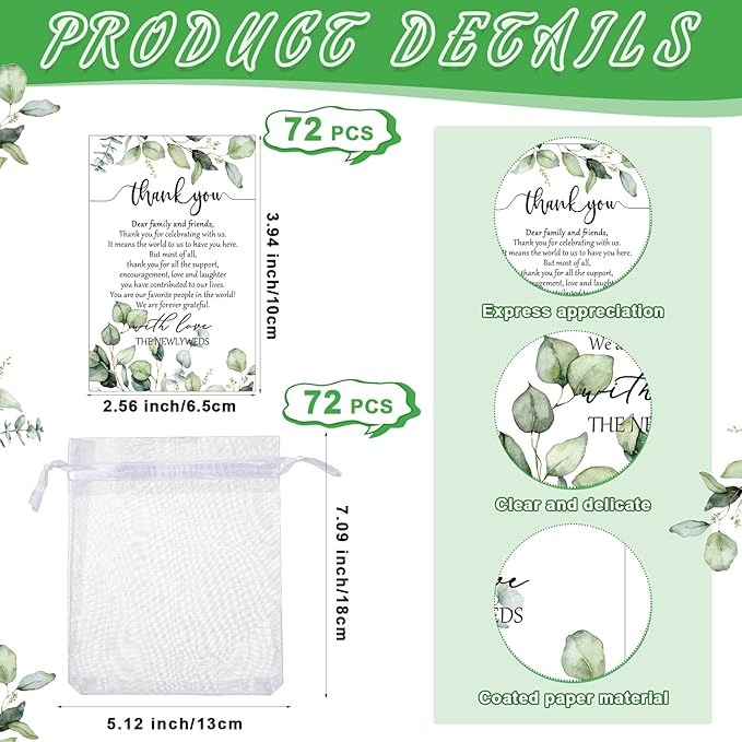 - Bulk Wedding Souvenirs for Guests: this set provides 72 wine corks, 72 bottle openers, 72 thank you cards, and 72 organza bags; This generous quantity and ideal mix are well suited for your daily usage and party gifting requirements