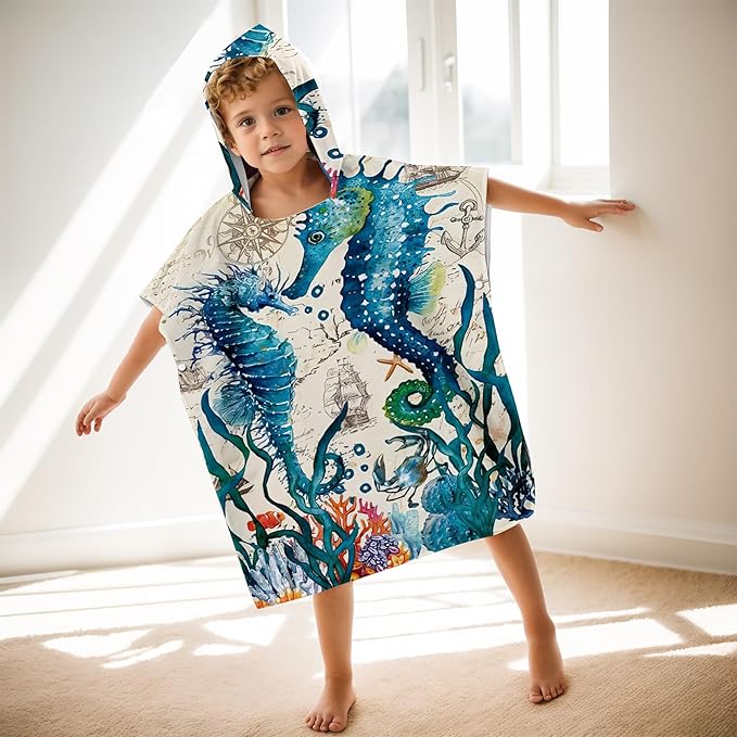 Seahorse Beach Towel with Hood for Boys Girls Premium Microfiber Kids Hooded Bath Towel Toddler Swim Pool Cover Up for 2-8 Years