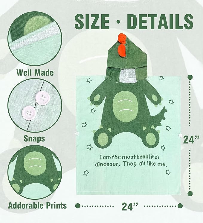 Toddler Bath Towel Hooded - Cotton Kids Beach Towel 24"x24" for Ages 1 to 5, Toddler Towels with Hood Snaps, Soft Terry Poncho Towel as Pool Swim Cover Ups for Girls Boys (Dino Green)