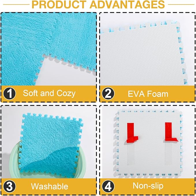 - EASY TO ASSEMBLE: Our plush foam floor riser saw matches perfectly, so you can easily assemble fuzzy interlocking foam floor tiles to create a piece of customized area of your own, simple and easy to dismantle and storage.Additionally,Unlike EVA carpets, they can provide warmth even in cold air-conditioned rooms, ensuring that your children play in a comfortable environment!