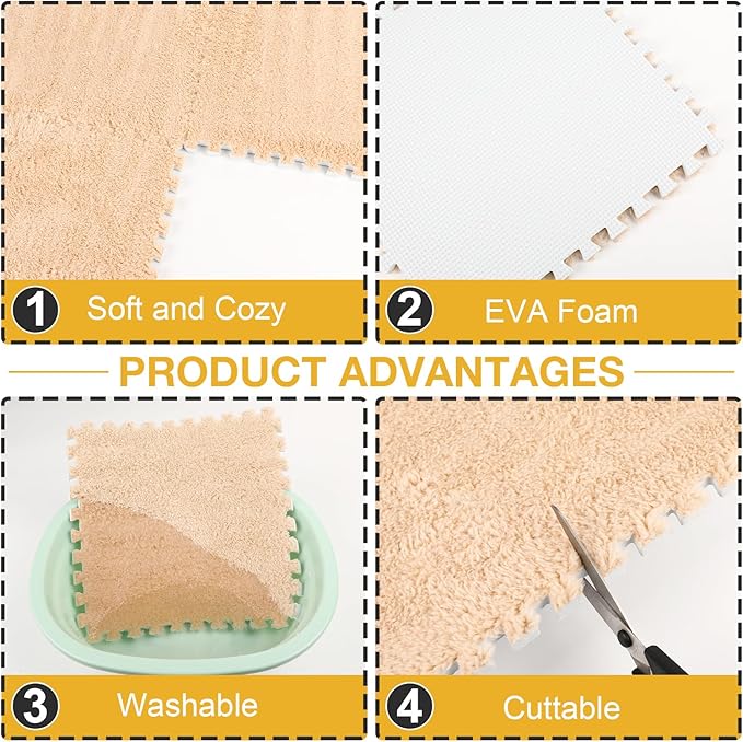 - EASY TO ASSEMBLE: Our plush foam floor riser saw matches perfectly, so you can easily assemble fuzzy interlocking foam floor tiles to create a piece of customized area of your own, simple and easy to dismantle and storage.Additionally,Unlike EVA carpets, they can provide warmth even in cold air-conditioned rooms, ensuring that your children play in a comfortable environment!