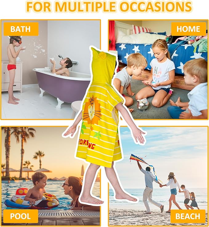 - 【Fully Wraps Around】This kids bath towel is designed with a hood and 1 pairs of snap buttons on the front. This design keeps kids fully wrapped and the towel won't drop off even when they run around. It's great to wrap kids with this wearable poncho towel after bathing and swimming.