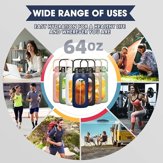 Glass Water Bottles 64 oz - Half Gallon Water Bottle with Straw Phone Holder Handle Time Marker and Silicone Sleeve, Large Motivational Water Jug with Carrier Bag for Daily Intake Gym Blue